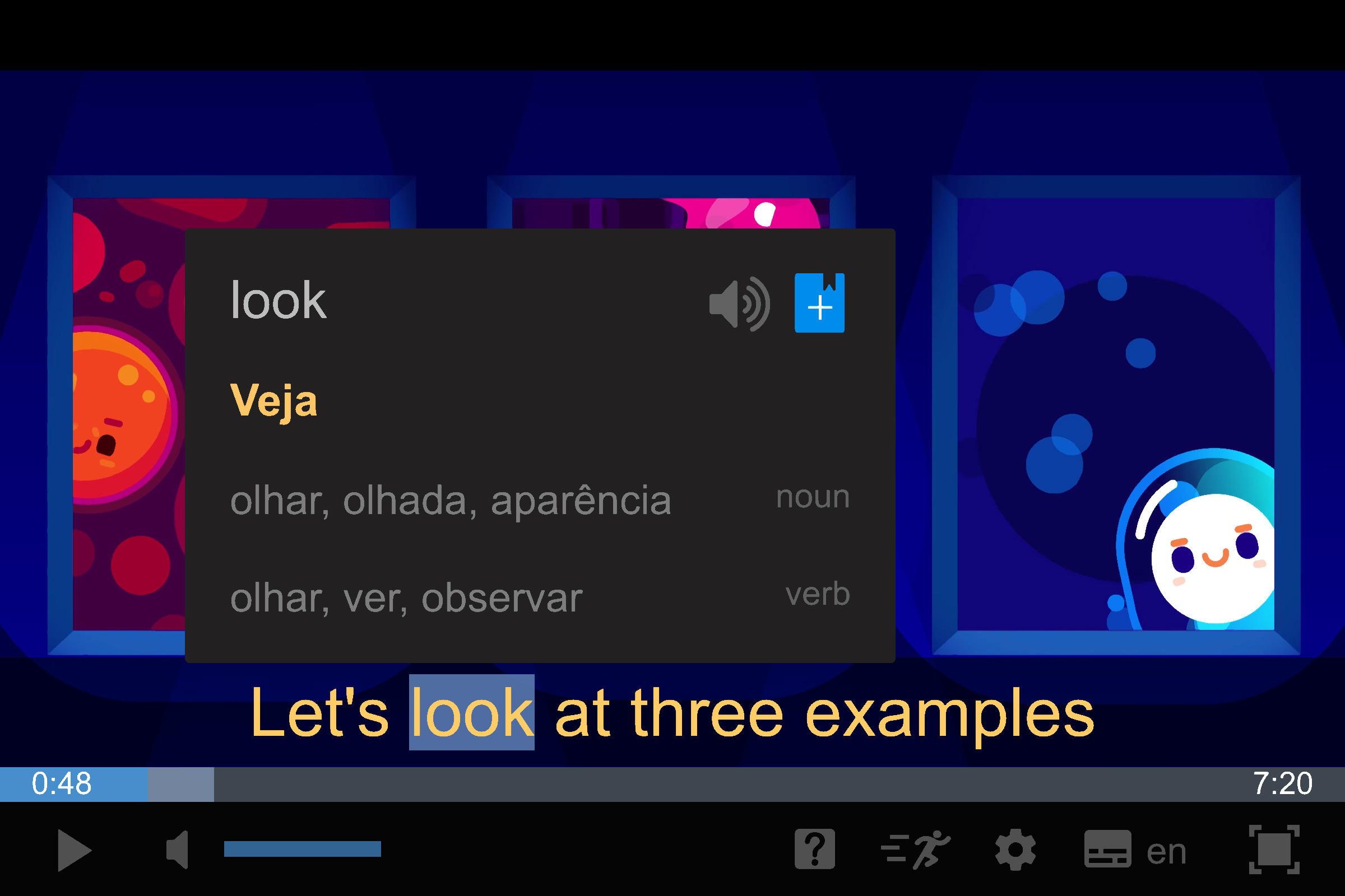 Traduza palavras desconhecidas ou frases inteiras ao assistir.